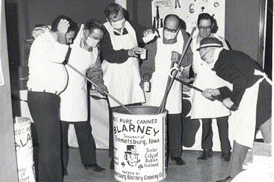 Along with the arrival of the Irish in the new world came their gift of eloquent speech; blarney, a quality known mostly to the Irish. With such an abundance found in Emmetsburg, the city fathers thought it only fitting to preserve such a valuable commodity. A group of scientists and chemists were engaged to accomplish this. The Blarney Cannery went into operation in the spring of 1962 and has continued production up to this day. In order to neutralize the potency of the Blarney, another product, Repellent, is now being processed at the plant.